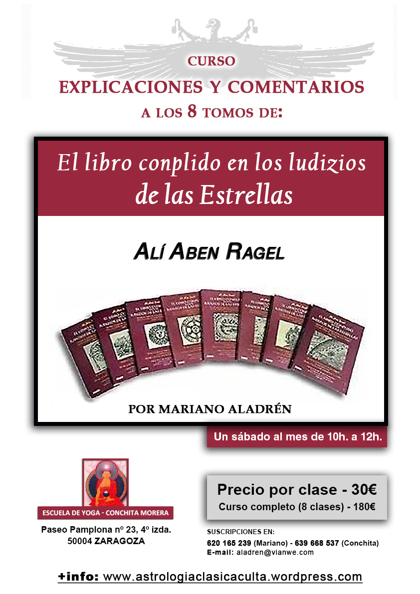 Continuará el curso de comentarios a textos clásicos astrológicos, siguiendo con los comentarios a la gran enciclopedia astrológica como es el Libro Conplido del ludizio de las Estrellas de Ali Aben Ragel, sobre la única edición completa de 8 tomos (Edt. Gracentro) serán 8 sábados en total, uno cada mes 2 horas de clase, dispondremos de una exégesis muy completa del texto, así complementaremos con obras contemporáneas, sobre todo las de origen persa y griega.