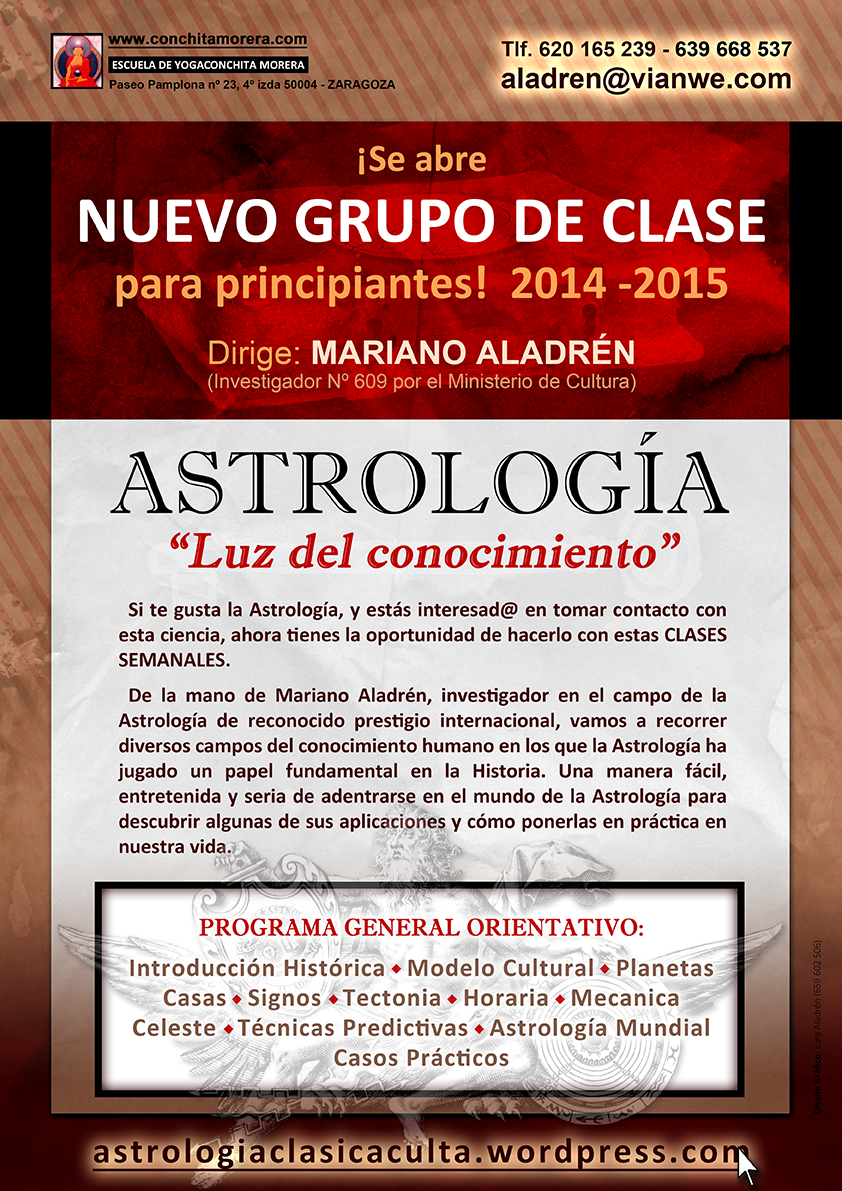 Si te gusta la Astrología, y estás interesad@ en tomar contacto con esta ciencia, ahora tienes la oportunidad de hacerlo con estas CLASES SEMANALES. De la mano de Mariano Aladrén, investigador en el campo de la Astrología de reconocido prestigio internacional, vamos a recorrer diversos campos del conocimiento humano en los que la Astrología ha jugado un papel fundamental en la Historia. Una manera fácil, entretenida y seria de adentrarse en el mundo de la Astrología para descubrir algunas de sus aplicaciones y cómo ponerlas en práctica en nuestra vida.