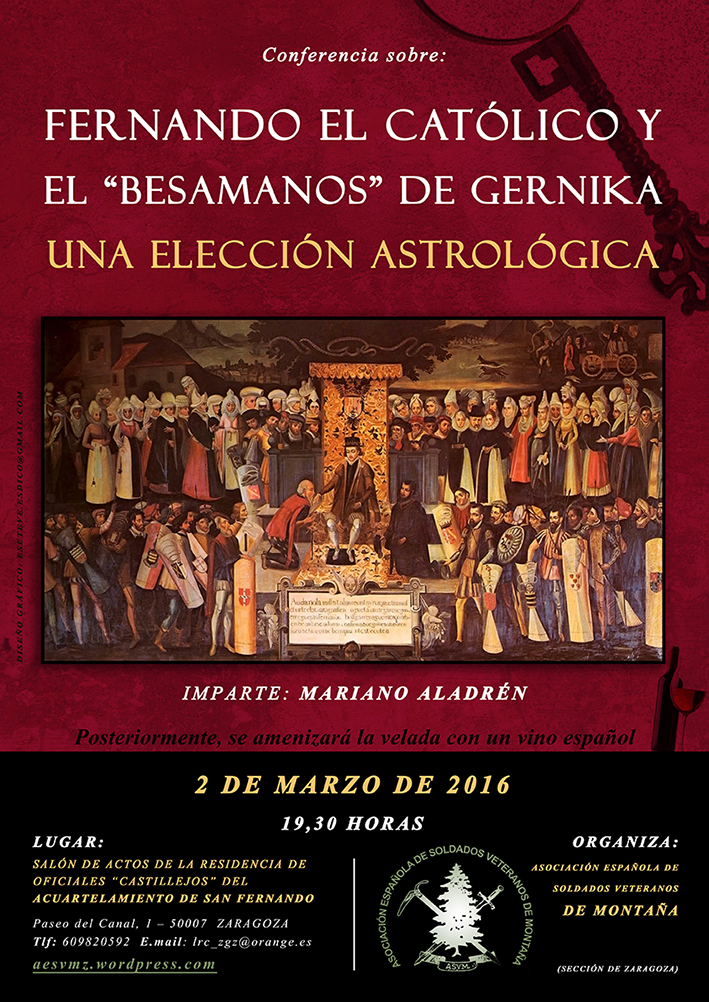 El próximo 2 de Marzo de 2016 tendrá lugar una conferencia sobre Fernando el Católico y el «Besamanos» de Gernika: Una elección astrológica.