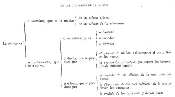 Se define la música como ciencia divina, gracias a la cual todas las cosas mundanas Se ponen en relación por medio de un vínculo inviolado, y por la que en cada una de las cosas lo semejante se relaciona con lo semejante en la misma proporción. Esta definición de música es adecuada para la mundana, la humana y la instrumental.