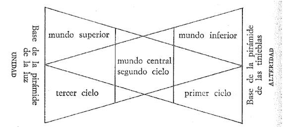 Toda la disposición armónica del macrocosmos se asienta sobre la interacción de dos pirámides, una formal y otra material, pirámide de la luz la primera, de las tinieblas la segunda; la pirámide o triangulo(en realidad son conos de energía) formal tiene su base en la misma Trinidad y llega hasta la superficie dela Tierra; la material tiene su base en la Tierra y llega con su cono hasta el límite de la última esfera.