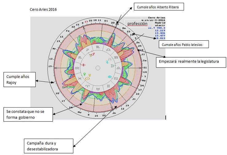 vez fracasado el escenario de pactos si miramos la RS del mundo para 2016. Podemos ver que Rajoy cumple años a continuación por tanto el impulso y el intento de remontar lo trataráde realizar el PP, estamos ante un año en el cual los escenarios de ideologías Nacionalistas van ha estar presentes en campaña, y a lo largo del año pensando en Saturno y Marte en X, a la vez que el cuestionamiento de el modelo de nación “monarquía parlamentaria” será atacado con virulencia, como se puede ver no existen astrodinas en la fecha de elecciones, por tanto como se realice la campaña será determinante para formar gobierno y sobre todo los debates televisados, como consecuencia de las astro dinas que están en periodo de campaña, se puede afirmar que aquí lo ocurrido en campaña será más determinante que en las votaciones anteriores.