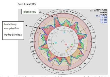 Si levantamos la RS del mundo para 2015 para Madrid veremos que queda afectado el día de la elecciones por una subida importante de astrodinas en el atacir de RS, esto nos permite deducir la importancia de estas elecciones, y Pedro Sánchez al ser el primero en cumplir años se vio con la fuerza necesaria para intentar un gobierno de coalición que fracasó por las pocas concordancias con los factores ideológicos y sociales de tema natal explicados en el anterior post.