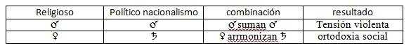 Esta observación trae como consecuencia que al incorporar a la religión islámica (Venus-Marte) el pensamiento nacionalista (Saturno – Marte) se establece una sustitución en su forma de expresión mediante la asimilación de Saturno por Venus (pues en el patrón zodiacal armonizan en el signo de Libra ) así será Marte (ver cuadro) el que une por lo marciano a las dos expresiones de pensamiento el religioso y el político.( ver tabla de mezcla).