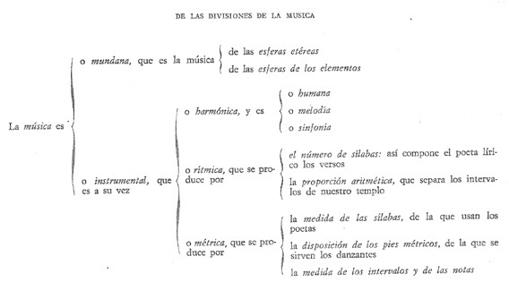 Se define la música como ciencia divina, gracias a la cual todas las cosas mundanas Se ponen en relación por medio de un vínculo inviolado, y por la que en cada una de las cosas lo semejante se relaciona con lo semejante en la misma proporción. Esta definición de música es adecuada para la mundana, la humana y la instrumental.