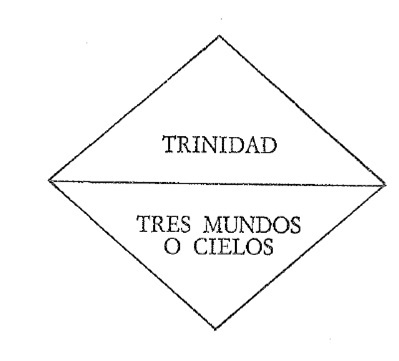 En su origen se emplea otro tipo de doble pirámide para mostrar el «desdoblamiento» de la Divinidad en el macrocosmos. Vemos, el triángulo de la Trinidad que se refleja como en un espejo en el triple mundo (empíreo, etéreo y sublunar o de los elementos) del siguiente modo:
