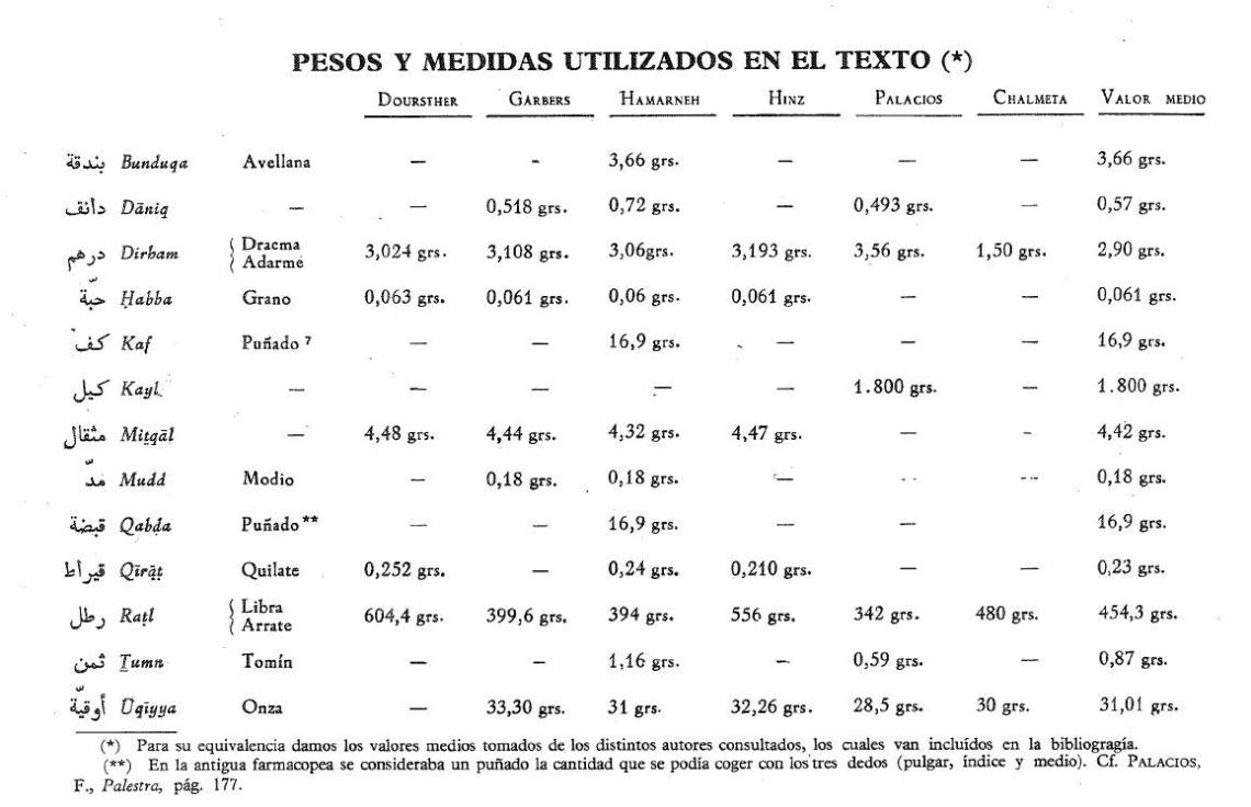 TABLA DE PESOS PARA APLICAR LOS RECETARIOS MEDICO-ASTROLÓGICOS DE ÁRABES Y PERSAS.