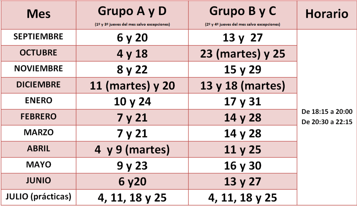 * Cuando el jueves sea festivo, la clase se desplazará al martes de esa semana o posterior.