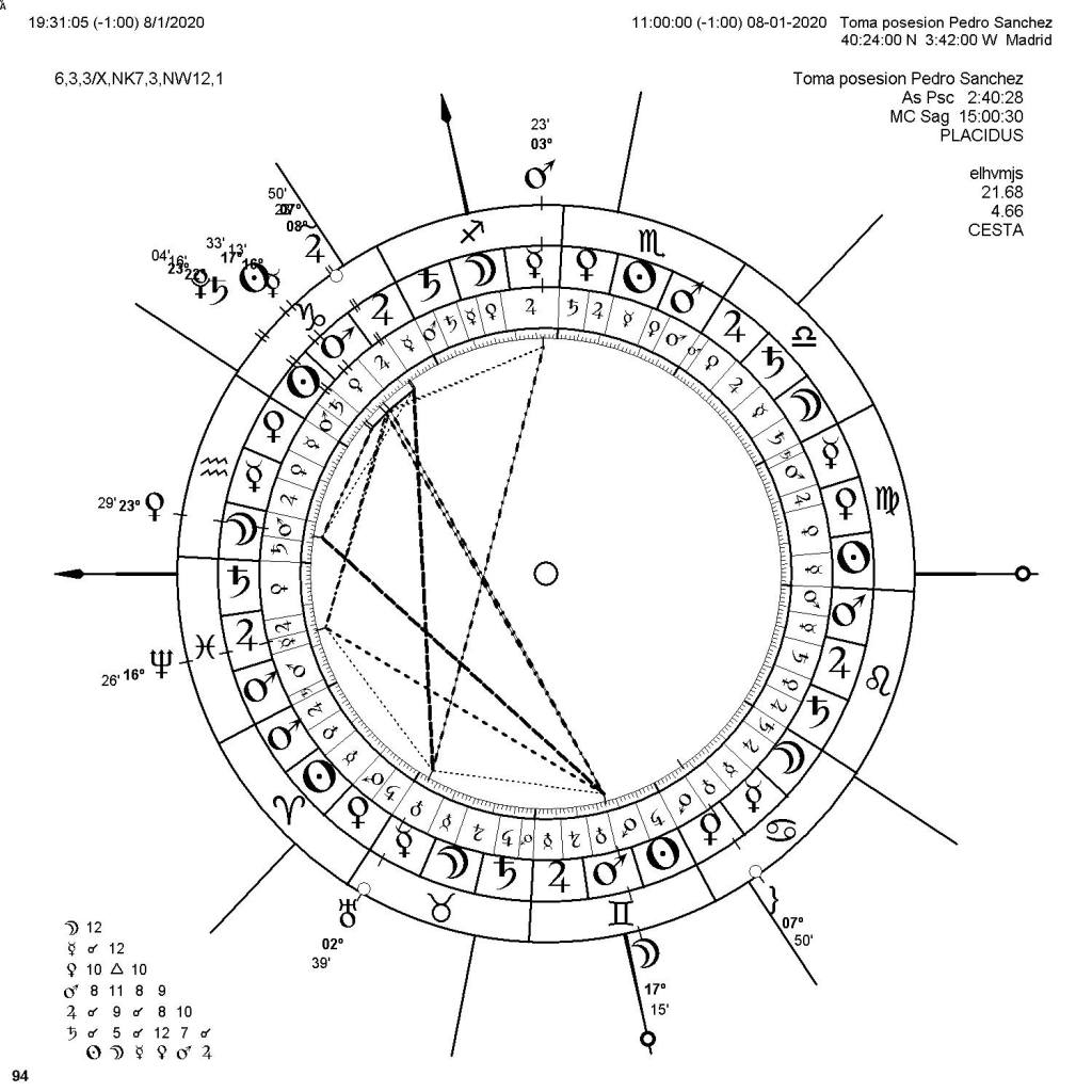 La toma de posesión es una carta de evento que junto con el natal y la RS en curso deben ser cuidadosamente conjeturadas. Contando siempre con la lunación precedente para conocer la tendencia temporal en que se enmarca el proceso que culmina invistiendo a un ser humano como presidente del gobierno de una nación de 47 millones de españoles. Si la analizamos minuciosamente veremos la coincidencia del asc (de la toma) con su Sol-Mercurio natal, coherente con su profesión de político (evento de investidura), resalta la importancia de casa XI, como relevante al ser muy cuestionado su liderazgo y necesitar de otros para la consecución del puesto. Así también es de resaltar la posición del planeta Marte en casa IX de la toma, que es XII de X, que marca la existencia de rivalidades internas del propio gobierno, Puesto que Marte participa en disposición de la casa XI de la toma. El que sea Marte representante del valor político de la «igualdad» apunta directamente a sus socios comunistas, no así la razón de su caída del puesto que fundamentalmente será por sus socios nacionalistas por ser Saturno el otro dispositor del grupo de planetas en XI, lugar por cierto donde se produjo la lunación precedente en capricornio, lugar en que la luna indicadora del tiempo parte mal, y termina en casa IV en géminis, que nos retrotrae a ese Sol de la toma (por Mercurio) uniendo el sentido patriótico del pueblo y sus dudas por la unidad de España (Luna en géminis en IV) que es uno de los objetivos que tiene que asegurar para obtener la confianza del pueblo. Si vemos la RS del mundo, veremos que la primera crisis puede estar a finales de julio principios agosto, y la siguiente sera en marzo de 2021, una vez producida la gran conjunción, la estimación de este gobierno bajo el auspicio de Marte y Saturno oscilara entre dos años a dos años y medio.