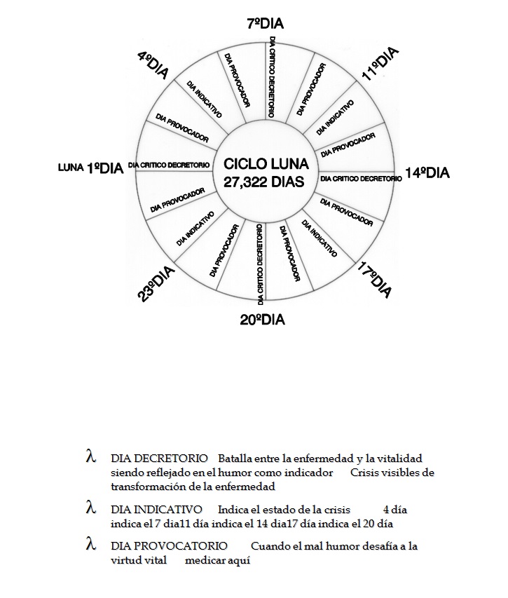 Disponemos lo astrólogos de la decumbitura para conocer bien los tiempos de la enfermedad, y nos prescribe como medicar con mas eficacia. (ver gráfico) partiendo del instante en que entramos en cama(cuando los síntomas nos hacen perder facultades que impiden una vida normal) la posición de la luna en su ciclo mensual determinara los puntos de inflexión de la crisis y sus fortalezas.