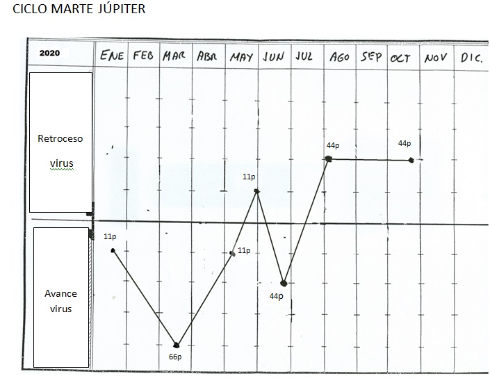 La clara correlación entre el ciclo combinado de Marte (virus) y Júpiter (sociedad humana) nos permite establecer de forma analógica sobre este gráfico la capacidad de resistencia del virus en la naturaleza humana y como consecuencia en su sociedad. Este gráfico es el que mejor puede reflejar el seguimiento y correlación de lo que da la luz combinada de los dos planetas y su consecuencia (el virus) en la fuerza de la naturaleza humana (reflejando lo social), los puntos o astrodinas asociados a los cambios del ciclo nos dan una idea de importancia o intensidad de la curva, ya que es lo que ponderaría realmente la amplitud de la curva del gráfico. Así el gráfico reflejaría solo la fuerza del virus alimentándose del universo en la naturaleza de la especie humana.
