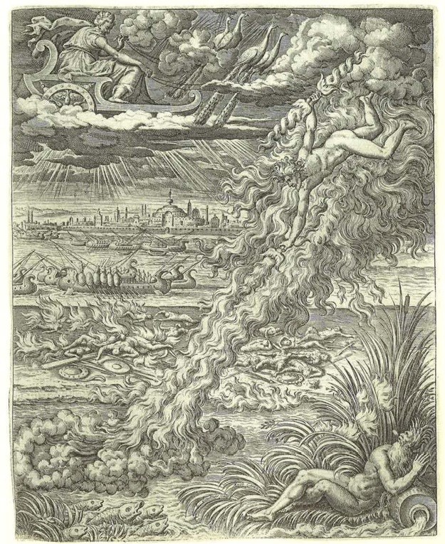 «El propio cielo se puso en movimiento, hasta que agitó a los combatientes; e irritado los arrojó derribados por tierra. Entonces, rápidamente, tras golpear sobre los baños del océano, prendieron fuego a toda la tierra; y el éter se quedó sin estrellas» (Oráculos Sibilinos libro 5º )