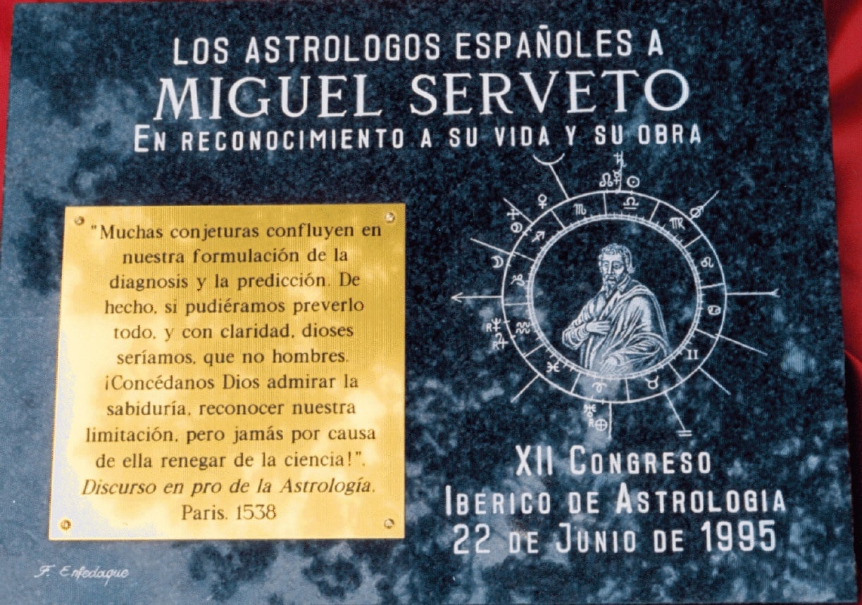 PLACA CONMEMORATIVA A LA DEFENSA DE LA ASTROLOGÍA DE MIGUEL SERVET, COLOCADA EN LA ANTIGUA UNIVERSIDAD DE ZARAGOZA Y «DENUNCIADA» POR LOS HIJOS DE LA ILUSTRACIÓN Y TRASLADADA A SU CASA MUSEO NATAL EN VILLANUEVA DE SIJENA. ¿AUN PENSAMOS QUE EL CATOLICISMO ES EL PROBLEMA?