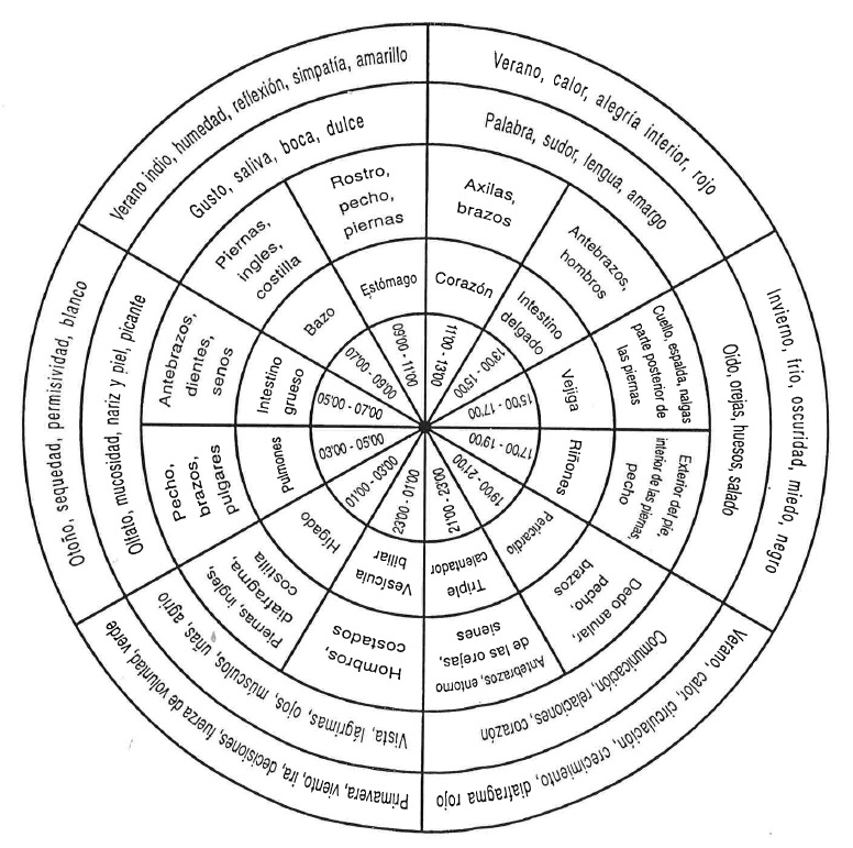 Círculo que explica efectos en la fisiología humana en base al ciclo anual del Sol y diario, va desde el ciclo diario en el centro, al ciclo anual de la periferia.